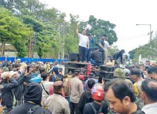 PALU – Serikat Pekerja Hukum Progresif Sulawesi Tengah, menggelar aksi demonstrasi di depan kantor Balai Wilayah Sungai (BWS) Sulawesi III, Rabu (30/7/2025), untuk menyuarakan penolakan terhadap keterlibatan Badan Usaha Milik Negara (BUMN) dalam pengerjaan proyek infrastruktur di wilayah Sulteng.
