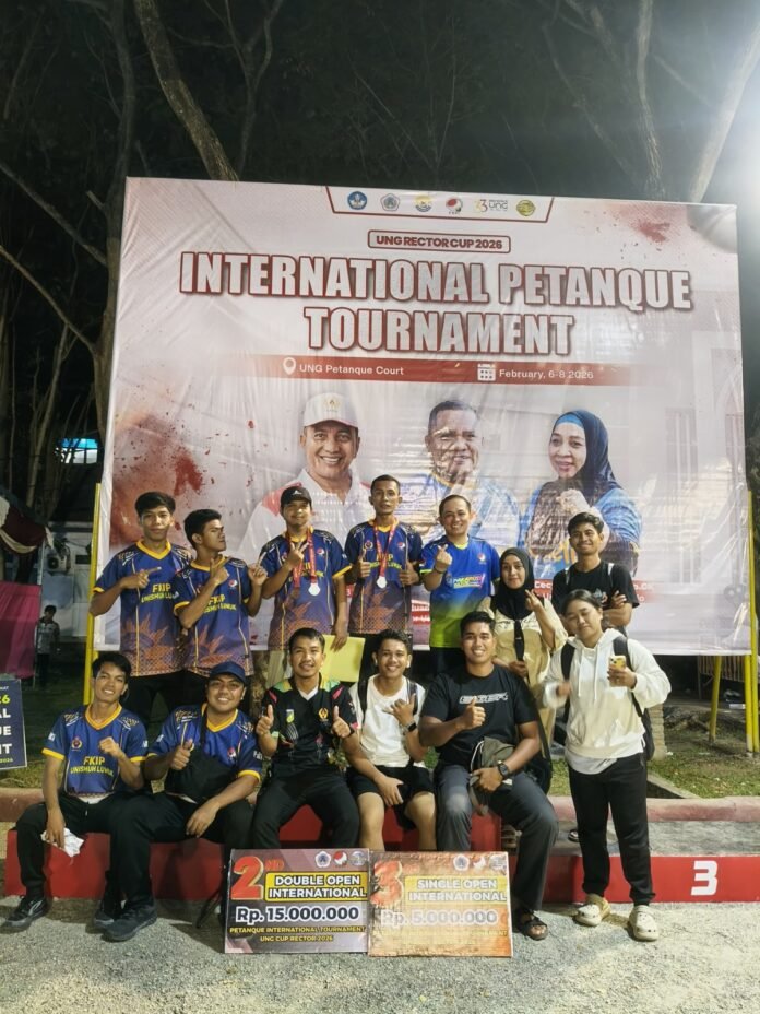 PALU – Prestasi membanggakan kembali ditorehkan atlet petanque Sulawesi Tengah. Heriyanto, atlet petanque asal Kabupaten Banggai yang memperkuat nama Kabuoaten Banggai Provinsi Sulawesi Tengah, sukses meraih medali perak nomor dobel open putra pada kejuaraan internasional Universitas Negeri Gorontalo (UNG) Cup 2026.