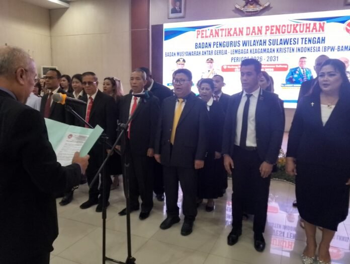 PALU, – Badan Pengurus Wilayah (DPW) Badan Musyawarah Antar Gereja – Lembaga Keagamaan Kristen Indonesia (BAMAG LKKI) Provinsi Sulawesi Tengah periode 2026–2031 dilantik dan dikukuhkan di ruang Pogombo, Kantor Gubernur Sulteng, Rabu (11/3/2026).