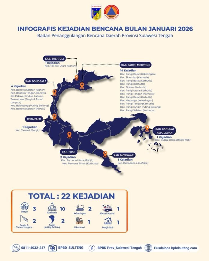 PALU — Sepanjang Januari 2026, tercatat sebanyak 22 kejadian bencana di wilayah Sulawesi Tengah.