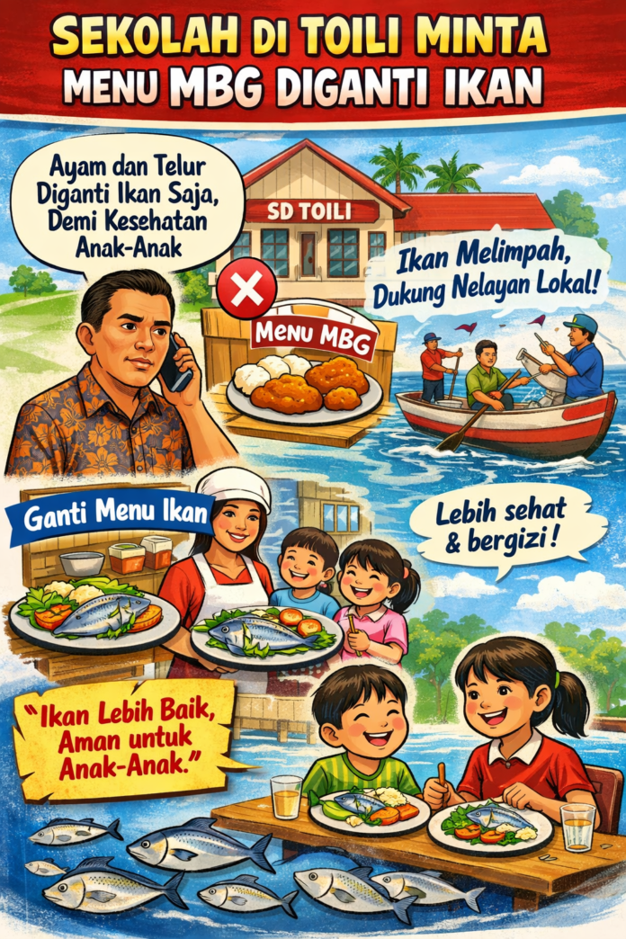 BANGGAI, – Salah satu Kepala Sekolah SD di wilayah Toili meminta perubahan menu dalam program Makan Bergizi Gratis (MBG). Ia mengusulkan agar menu berbahan ayam dan telur diganti dengan ikan demi kesehatan siswa dan pemanfaatan potensi lokal.