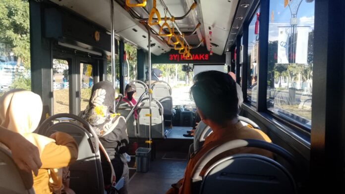 Tim Radar Sulteng turut mencoba menaiki armada Trans Palu dari halte depan Lapangan Vatulemo, melintasi Jalan Prof. Moh. Yamin, Dewi Sartika, Karanja Lembah, Touwa hingga Taman GOR.