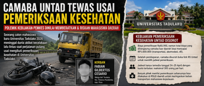 PALU, – Seorang calon mahasiswa baru (camaba) dilaporkan meninggal dunia dalam kecelakaan lalu lintas usai mengikuti pemeriksaan kesehatan di RS Untad Palu.