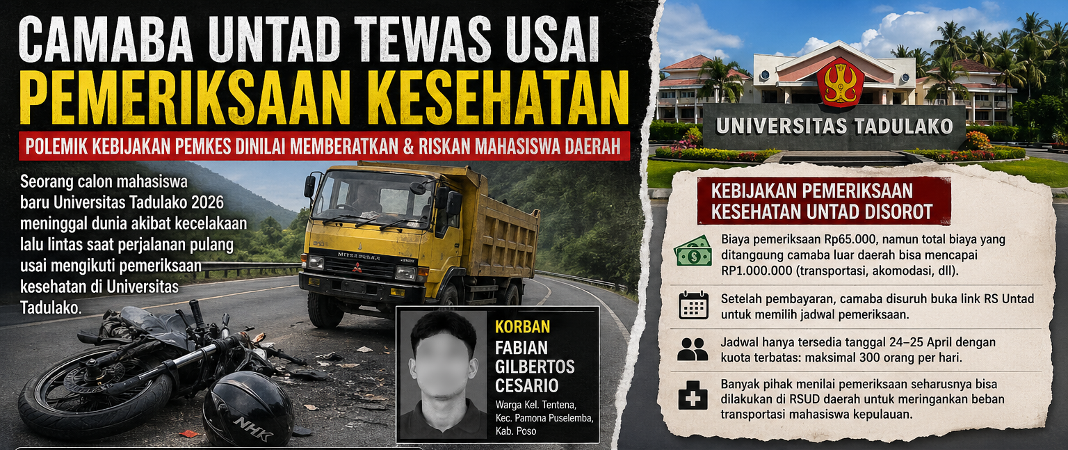 Terkait meninggalnya camaba Untad dari Poso, Sebelumnya, Ikatan Pemuda Banggai Kepulauan Palu menilai kebijakan pemeriksaan kesehatan di Universitas Tadulako memberatkan mahasiswa dari daerah kepulauan atau daerah terjauh.