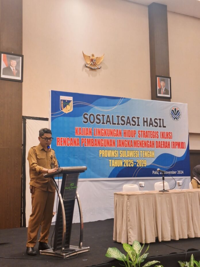 PALU-Dinas Lingkungan Hidup (DLH) Provinsi Sulawesi Tengah menyosialisasikan hasil Kajian Lingkungan Hidup Strategis (KLHS) Rencana Pembangunan Jangka Menengah Daerah (RPJMD) Provinsi Sulawesi Tengah Tahun 2025-2029 di Santika Hotel, Senin (25/11/2024).