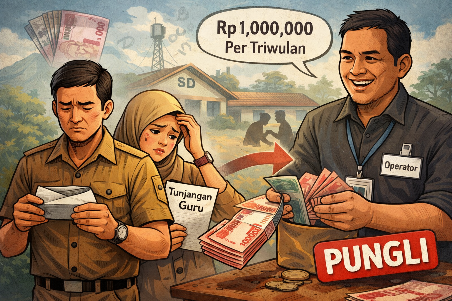 Para guru daerah terpencil harus menerima nasib kurang baik karena hak mereka justru dipotong Rp1 juta per orang setiap triwulan. Bahkan saat ini, pemotongan dilakukan oleh operator sebesar Rp300 ribu per bulan.