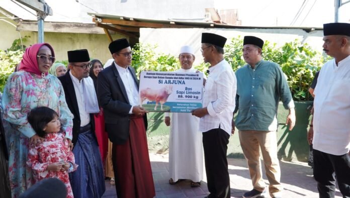 PALU-Gubernur Sulawesi Tengah (Sulteng), H.Rusdy Mastura menyerahkan secara langsung Bantuan Kemasyarakatan (Banmas) Presiden RI Joko Widodo berupa sapi kurban bernama ‘Arjuna’ untuk disembelih pada Hari Raya Idul Adha 1445 Hijriah/Tahun 2024. Penyerahan tersebut berlangsung di Masjid Jami Talise, jalan Tombolotutu, Senin (17/06/2024).