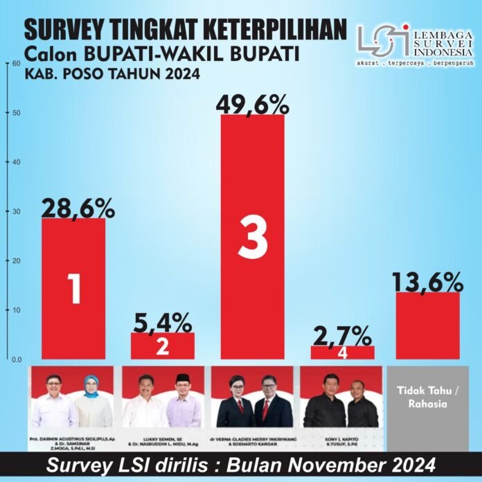 POSO – Survei terbaru yang dilakukan oleh Lembaga Survei Indonesia (LSI) pada November 2024 menunjukkan pasangan calon bupati dan wakil bupati Poso, Verna-Suharto, unggul sangat signifikan dari tiga pasangan calon lainnya.