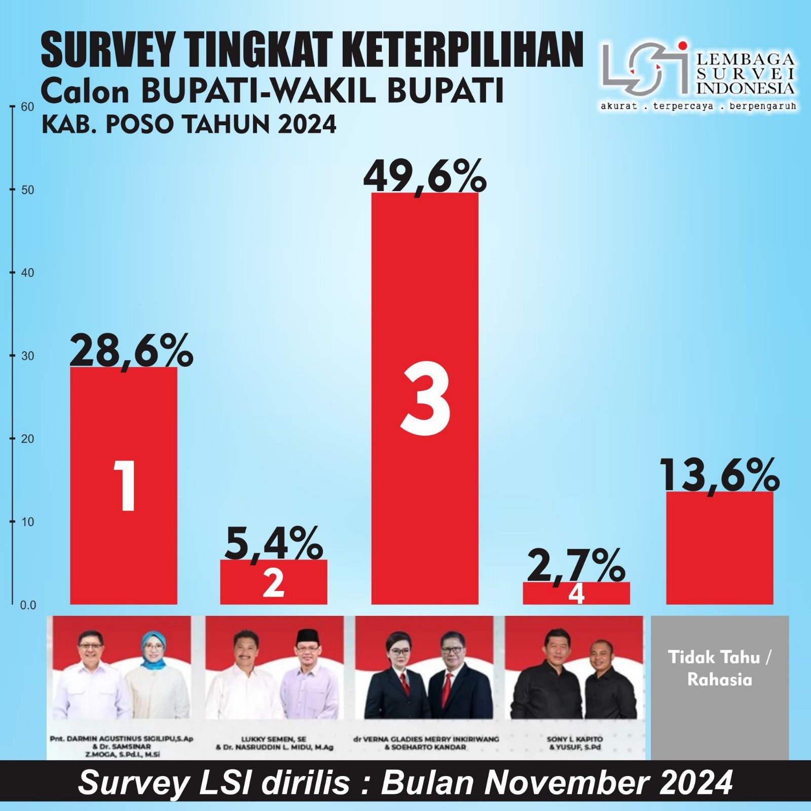LSI mencatat bahwa survei ini memiliki margin of error tertentu dan menggambarkan potret preferensi masyarakat Poso pada periode November 2024. Pasangan Verna-Suharto diharapkan akan terus berupaya mempertahankan keunggulan ini, sementara pasangan lainnya juga akan melakukan berbagai upaya untuk merebut simpati pemilih. (bud)