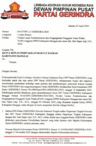 Ketua Umum Lembaga Advokasi Hukum Indonesia Raya DPP Partai Gerindra, M. Maulana Bungaran, SH, MH telah memberi warning kepada Ketua DPRD Banggai, H.Saripudin Tjatjo, SH, dan Ketua KPU, Santo Gotia dengan melayangkan surat, perihal tindak lanjut pemberhentian dan PAW Aleg DPRD Banggai HSA.