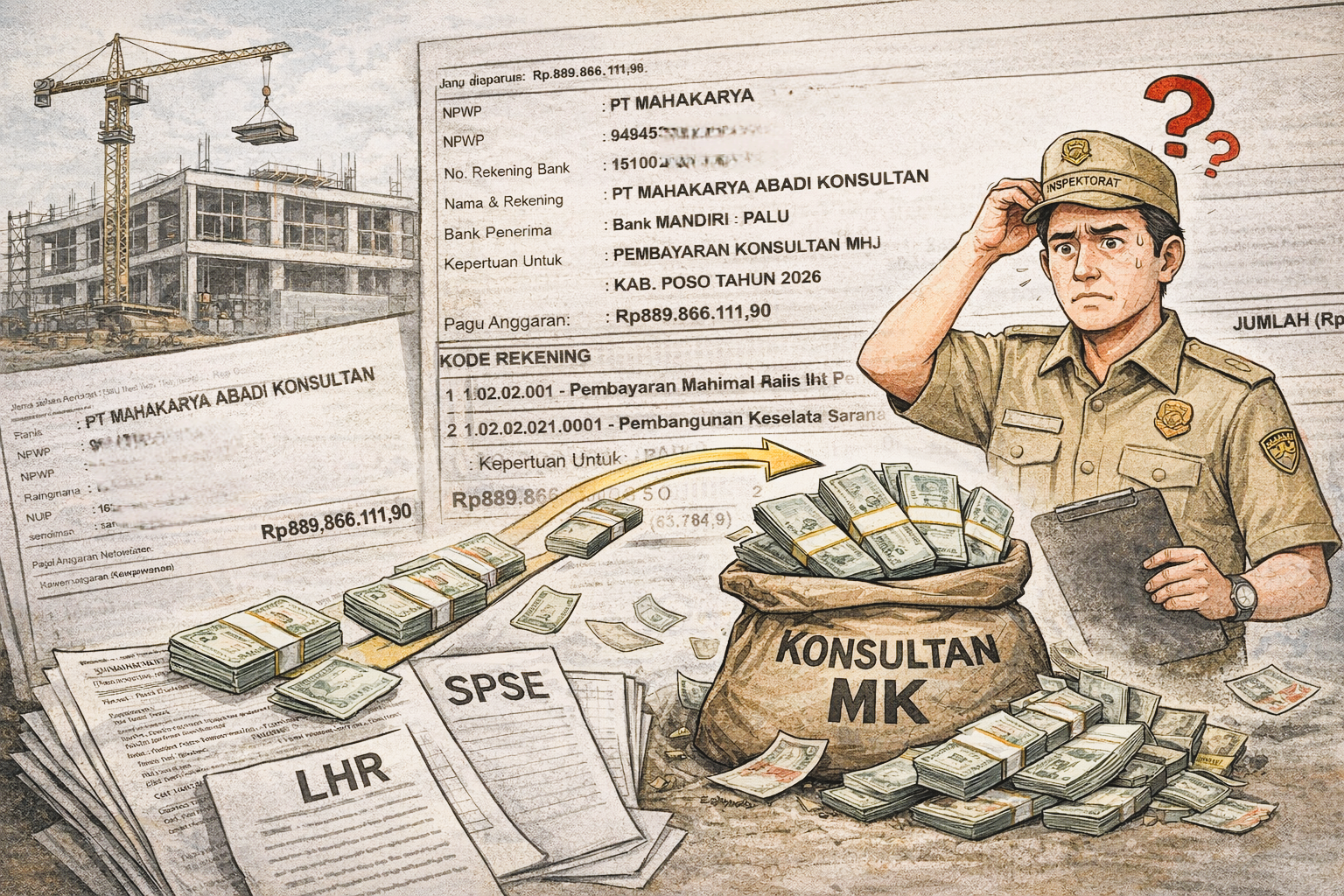 Berdasarkan dokumen yang diperoleh, pencairan dana sebesar Rp889.866.111,90 dilakukan kepada PT Mahakarya Abadi Konsultan melalui rekening Bank Mandiri. Pembayaran tersebut tercatat sebagai pembayaran jasa Konsultan MK untuk pekerjaan pembangunan RSUD Baru Poso.