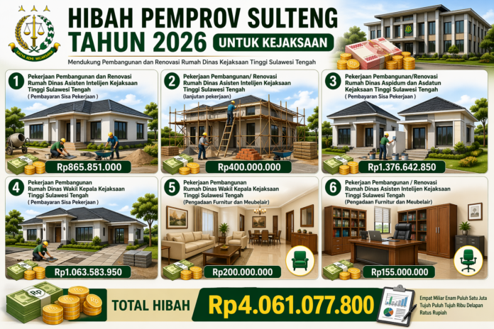 PALU, – Pemerintah Provinsi Sulawesi Tengah tetap mengalokasikan dana hibah lebih dari Rp4 miliar pada tahun anggaran 2026 untuk pembangunan dan renovasi rumah jabatan pejabat di lingkungan Kejaksaan Tinggi (Kejati) Sulawesi Tengah, termasuk pengadaan furnitur dan meubelair.