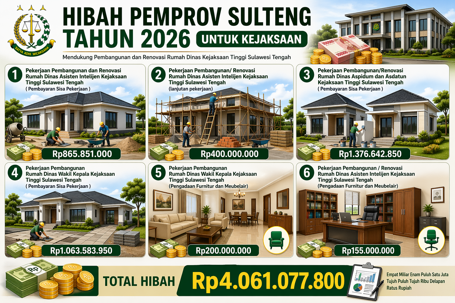 Tidak hanya pembangunan fisik, anggaran hibah juga mencakup pengadaan furnitur dan meubelair, masing-masing Rp200.000.000 untuk Rumah Dinas Wakil Kepala Kejati dan Rp155.000.000 untuk Rumah Dinas Asisten Intelijen.