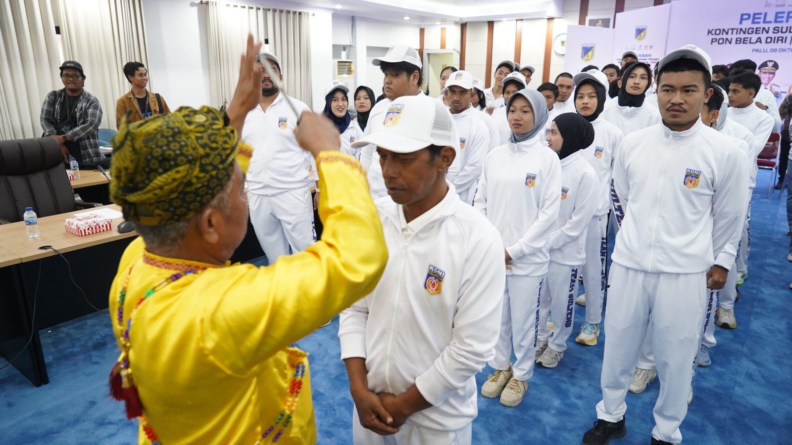 Upacara pelepasan yang digelar di Aula Polibu, Kantor Gubernur Sulteng, Kamis (9/10/2025) itu berlangsung istimewa karena dikemas dalam upacara adat Kail Mompakaroso. Dalam prosesi tersebut, guma—senjata adat Kaili—ditempelkan ke seluruh atlet sebagai simbol ketajaman, kekuatan, dan keberanian.