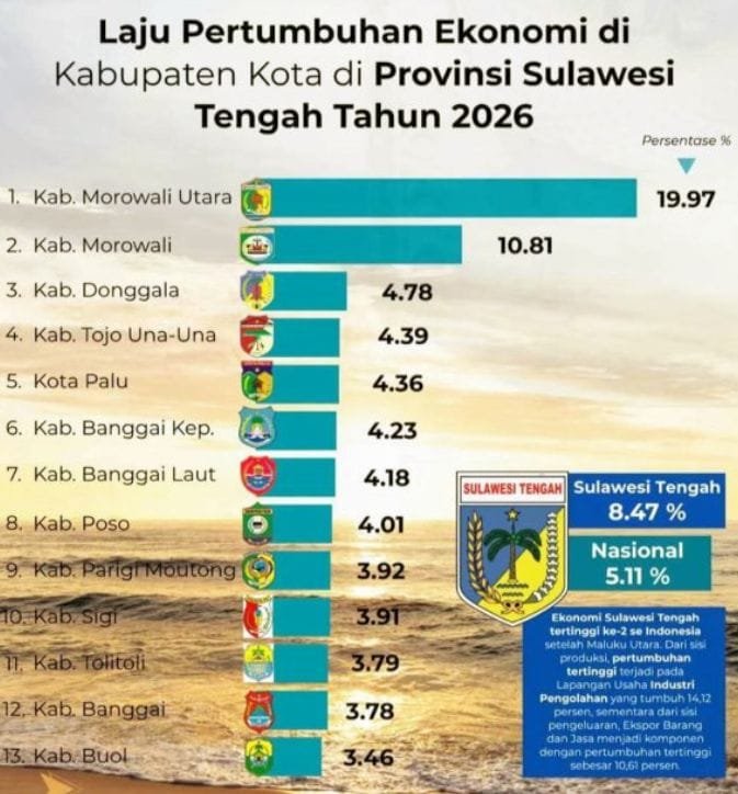 Berikut laju pertumbuhan ekonomi Kabupaten/Kota di Sulteng tahun 2026. 1. Morowali Utara (19,97 %), 2. Kab. Morowali (10,81 %), 3. Kab. Donggala (4,78 %), 4. Kab. Tojo Una-Una (4,39 %), 5. Kota Palu (4,38 %), 6. Kab. Banggai Kepulauan (4,23 %), 7. Kab.Banggai Laut (4,18 %), 8. Kab. Poso (4,01 %), 9.Kab. Parigi Moutong (3,92 %), 10. Kab. Sigi (3,91 %), 11. Kab. Tolitoli (3,79 %), 12. KAB. BANGGAI (3,78 %), 13. Kab. Buol (3,46 %).