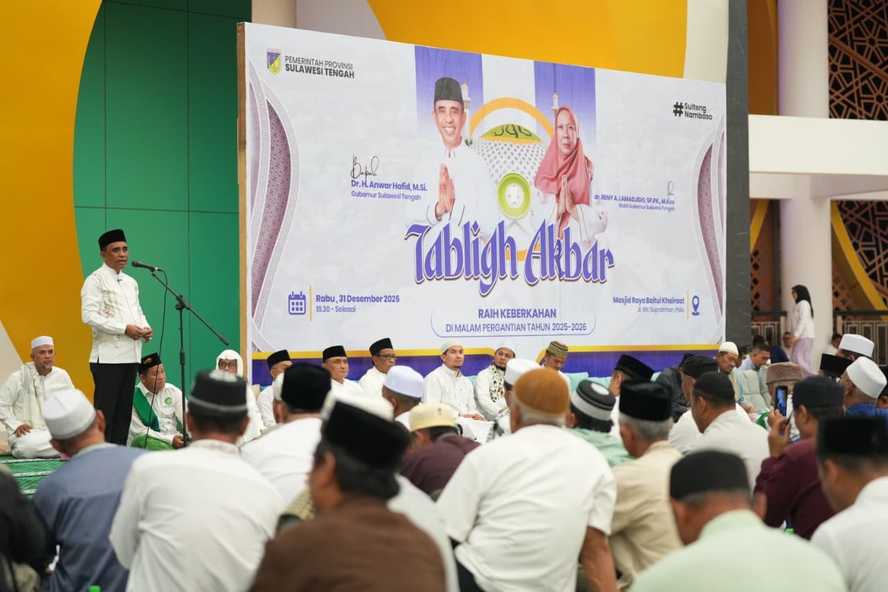 PALU – Gubernur Sulawesi Tengah Dr. H. Anwar Hafid bersama Wakil Gubernur dr. Reny A. Lamadjido mengisi malam pergantian tahun dengan menggelar Tabligh Akbar dan dzikir bersama masyarakat di Masjid Raya Baitul Khairaat Palu, Rabu malam (31/12/2025). Ribuan jamaah memadati masjid terbesar di Sulawesi Tengah itu untuk menutup tahun dengan suasana religius dan penuh khidmat.