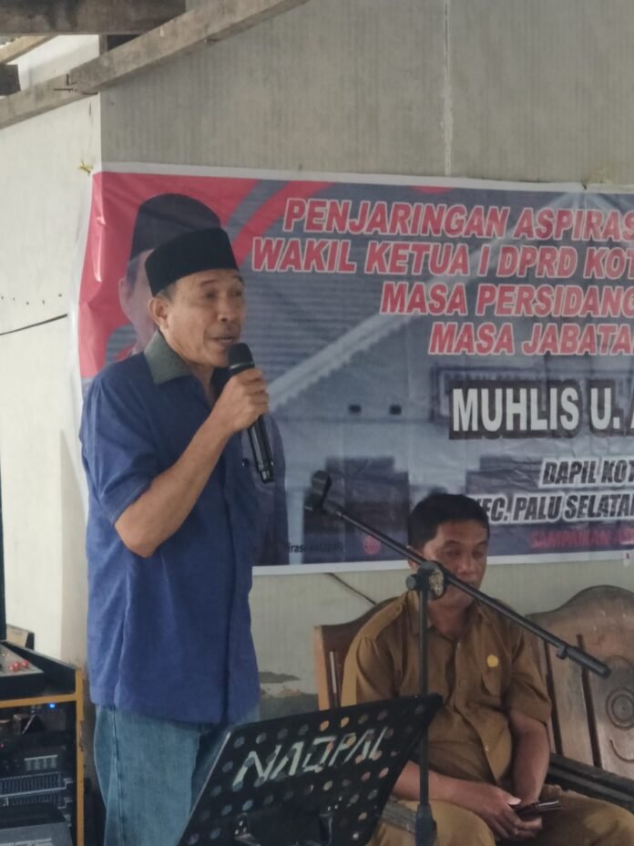 PALU – Wakil Ketua I Dewan Perwakilan Rakyat Daerah (DPRD) Kota Palu Muhlis. U. Aca. S. Sos, saat melakukan reses atau penjaringan aspirasi di Kelurahan Petobo, Kecamatan Palu Selatan, Kota Palu, Selasa (15/7/2025) di minta masyarakat untuk memfasilitasi dengan membuka kembali jalan HM. Suharto yang rusak akibat bencana gempa bumi dan likuifaksi pada 2018 silam.